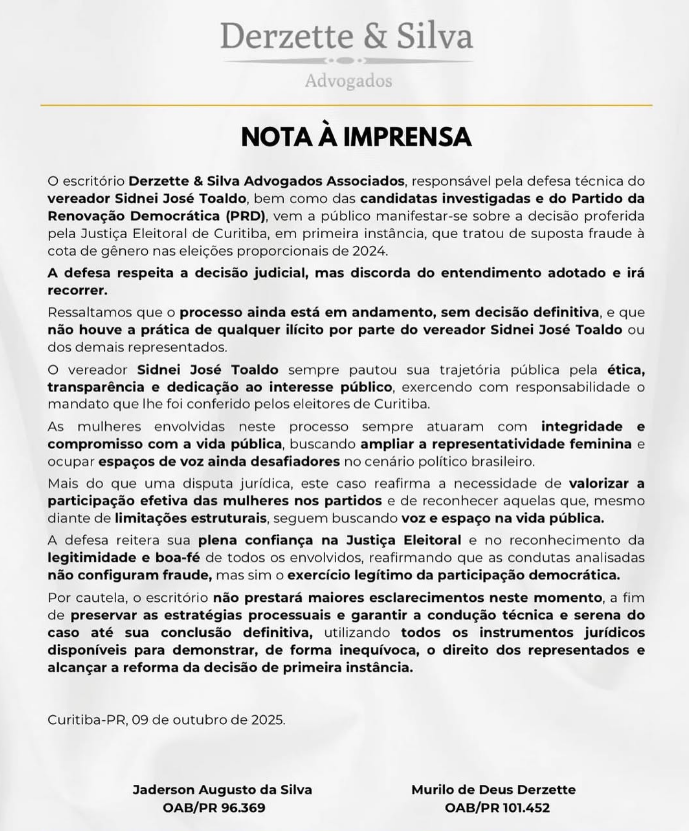 O vereador de Curitiba Sidnei Toaldo (PRD) teve o mandato cassado nesta quarta-feira (8) pelo juiz Fernando Augusto Fabrício de Melo, da 175ª Zona Eleitoral de Curitiba, por fraude à cota de gênero envolvendo quatro mulheres da chapa do PRD nas eleições de 2024. Cabe recurso da decisão ao Tribunal Regional Eleitoral do Paraná (TRE) e, posteriormente, ao Tribunal Superior Eleitoral (TSE).